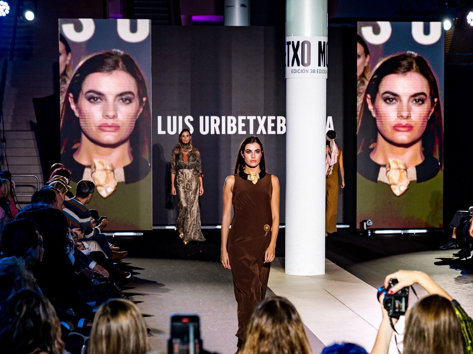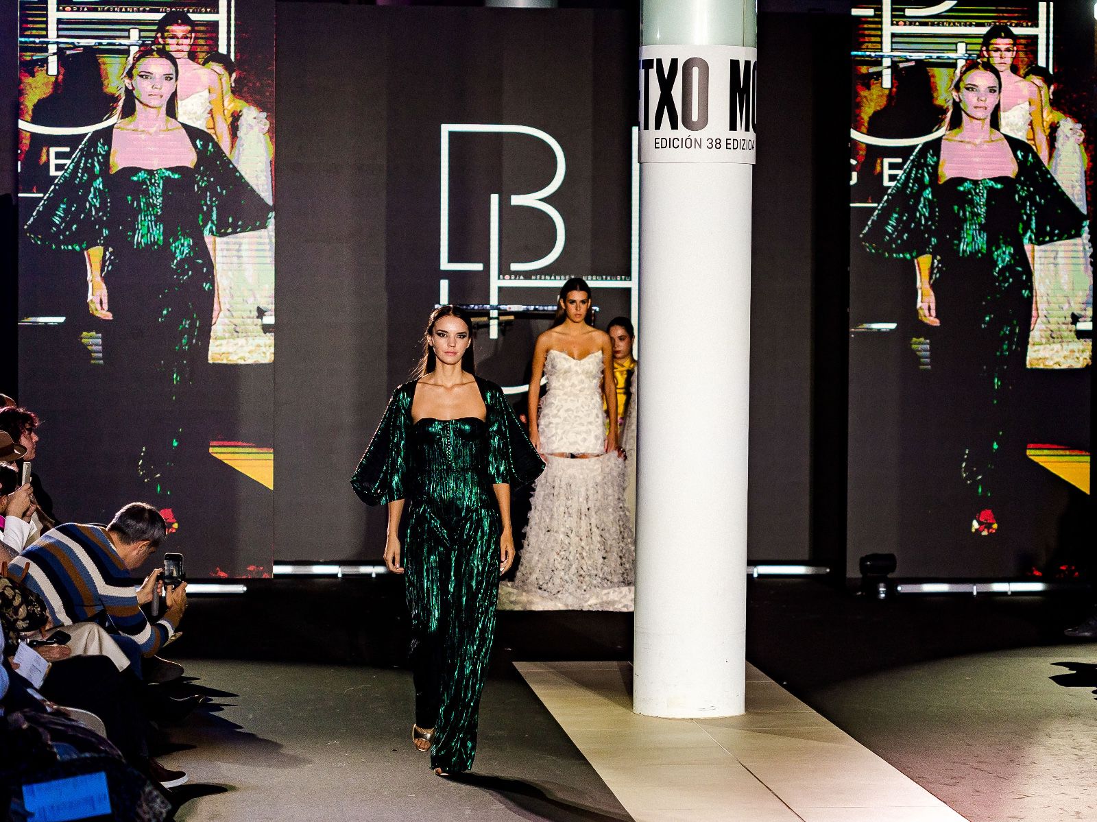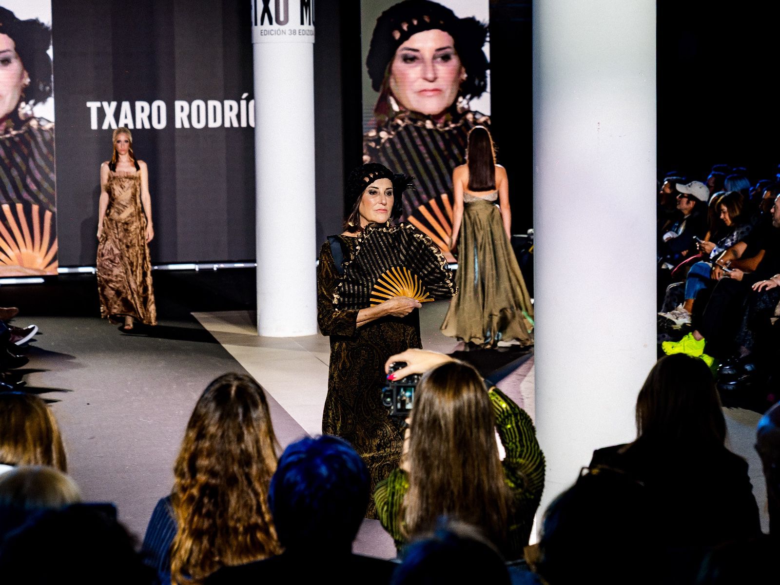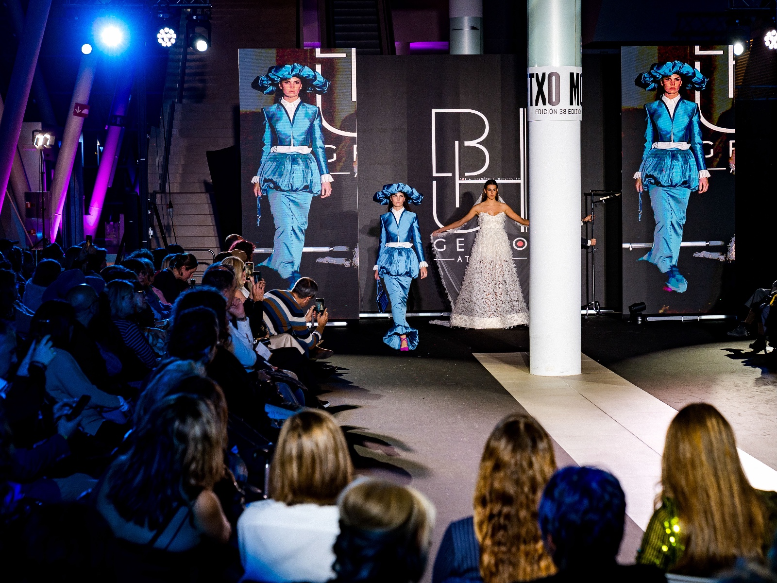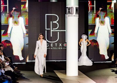 El desfile avanzó entre tejidos brillantes, lentejuelas y volúmenes en los complementos, un recorrido donde la precisión del corte y del patronaje terminó por definir la narrativa estética. El cierre llegó con una propuesta nupcial que sintetizaba su dominio técnico: varios diseños de novia y, como colofón, una aparición especialmente emotiva con un velo, salpicado de destellos que componían la inscripción GETXO MODA. Un final que funcionó como homenaje personal y cierre poético del pase.